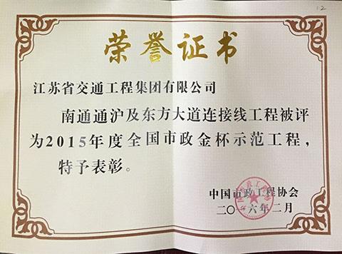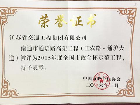 在项目全体员工的共同努力下,项目部顺利完成了合同各项内容,得到了业主和社会各方的认可,先后获得了省级和市级文明工地、紫琅杯等荣誉,并最终通过中国市政工程协会的评审,取得了市政行业在工程质量方面的最高荣誉——“全国市政金杯示范工程”称号。