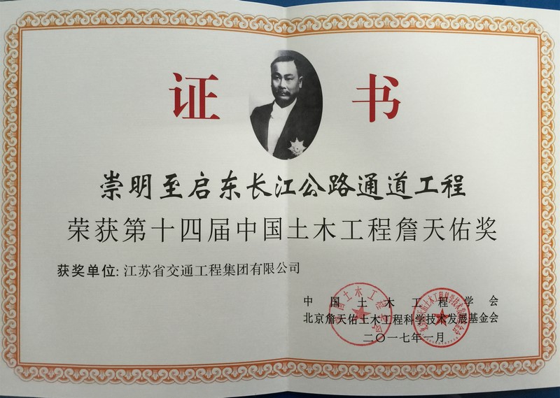 此次荣获的“詹天佑奖”是中国土木工程设立的最大奖项。此外,该工程还先后荣获了中国公路学会科学技术奖特等奖、公路交通优秀设计一等奖、江苏省扬子杯优质工程奖等多个奖项。(王 熹)