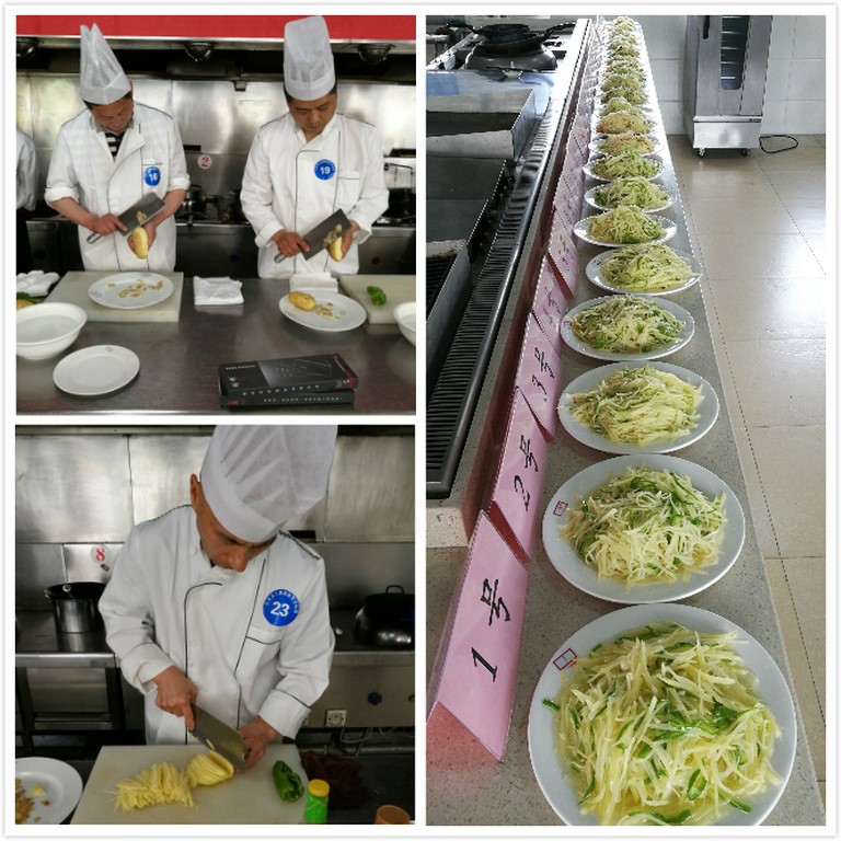 根据活动安排,本次厨艺比拼要求厨师完成两个菜式,其中的规定菜式为青椒土豆丝,自选菜式为草鱼料理。23位厨师分成3组先后参加比赛,随着评委宣布比赛开始,烹饪实训教室的气氛瞬间变得火热起来,各位厨师们开始着手清洗食材、削皮、切片,一道道工序有条不紊的进行。随着食材下锅、翻炒、添加佐料、起锅,一股股浓郁的香味弥漫在了整个教室。大致十分钟左右,23份青椒土豆丝就摆在了评委们面前。
