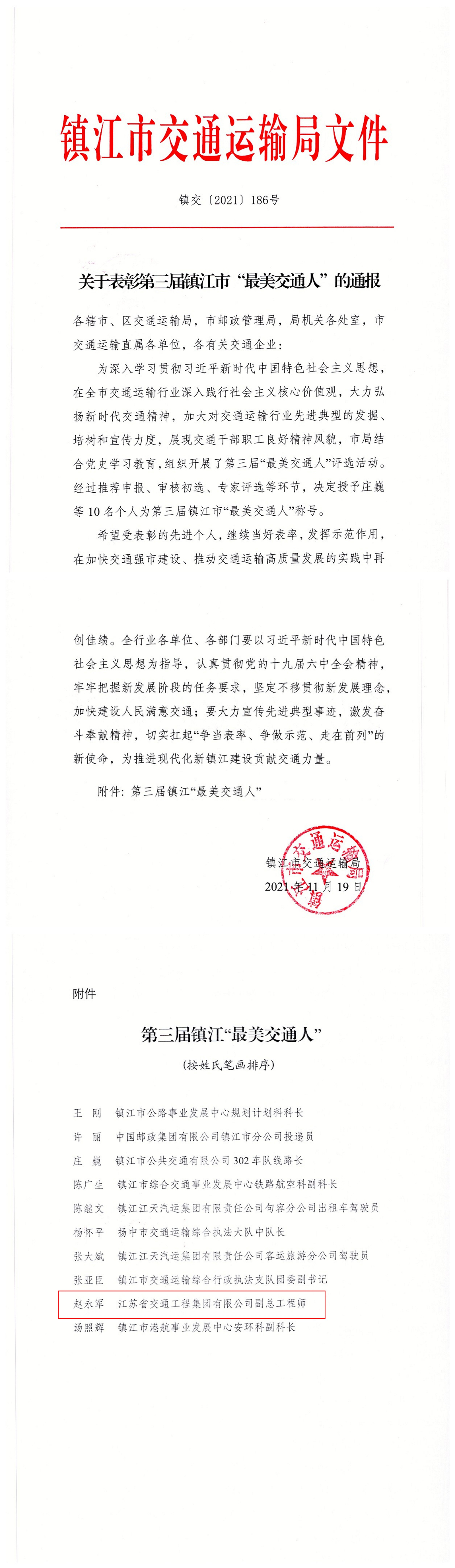 集团副总工程师赵永军当选第三届镇江“最美交通人”