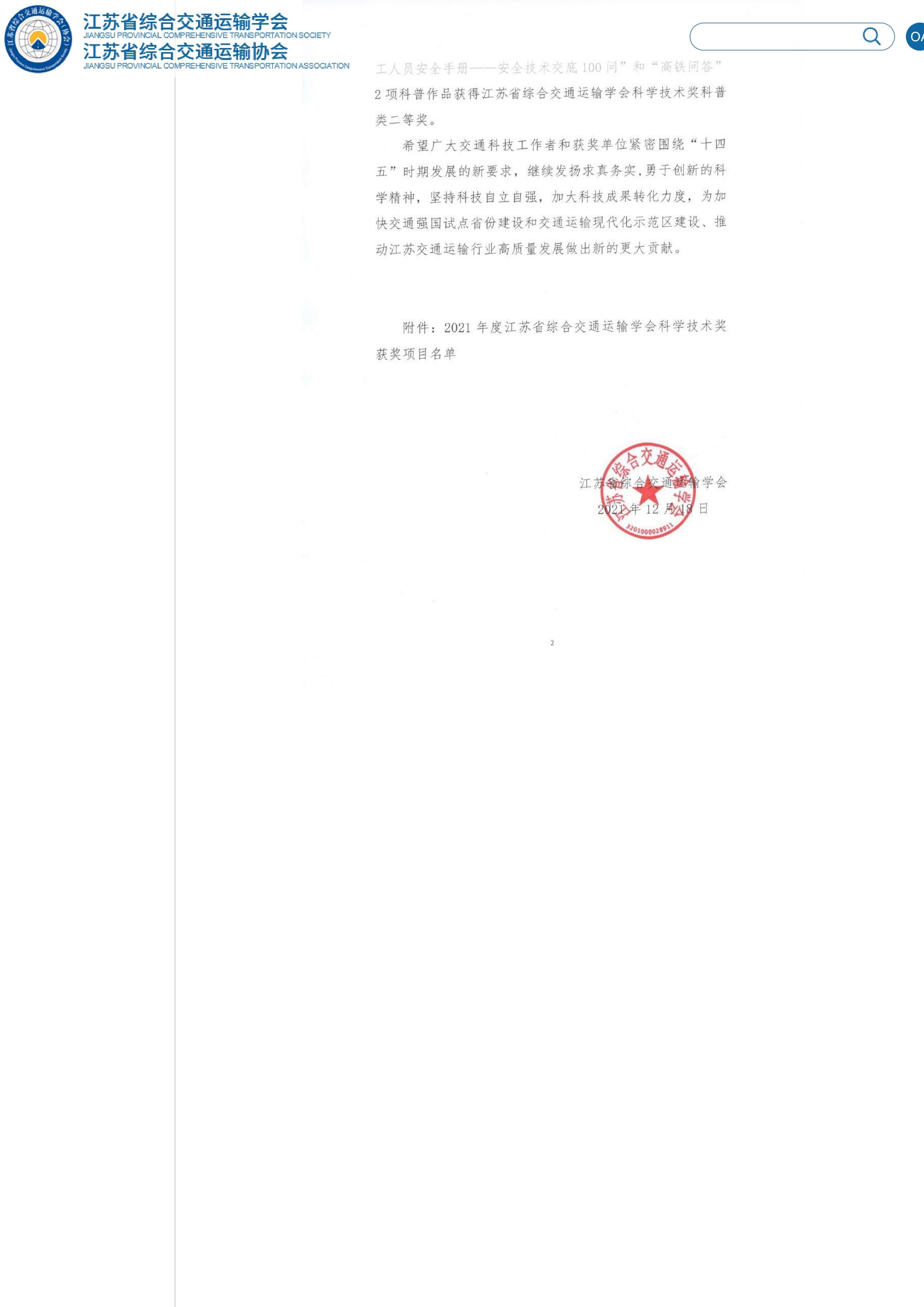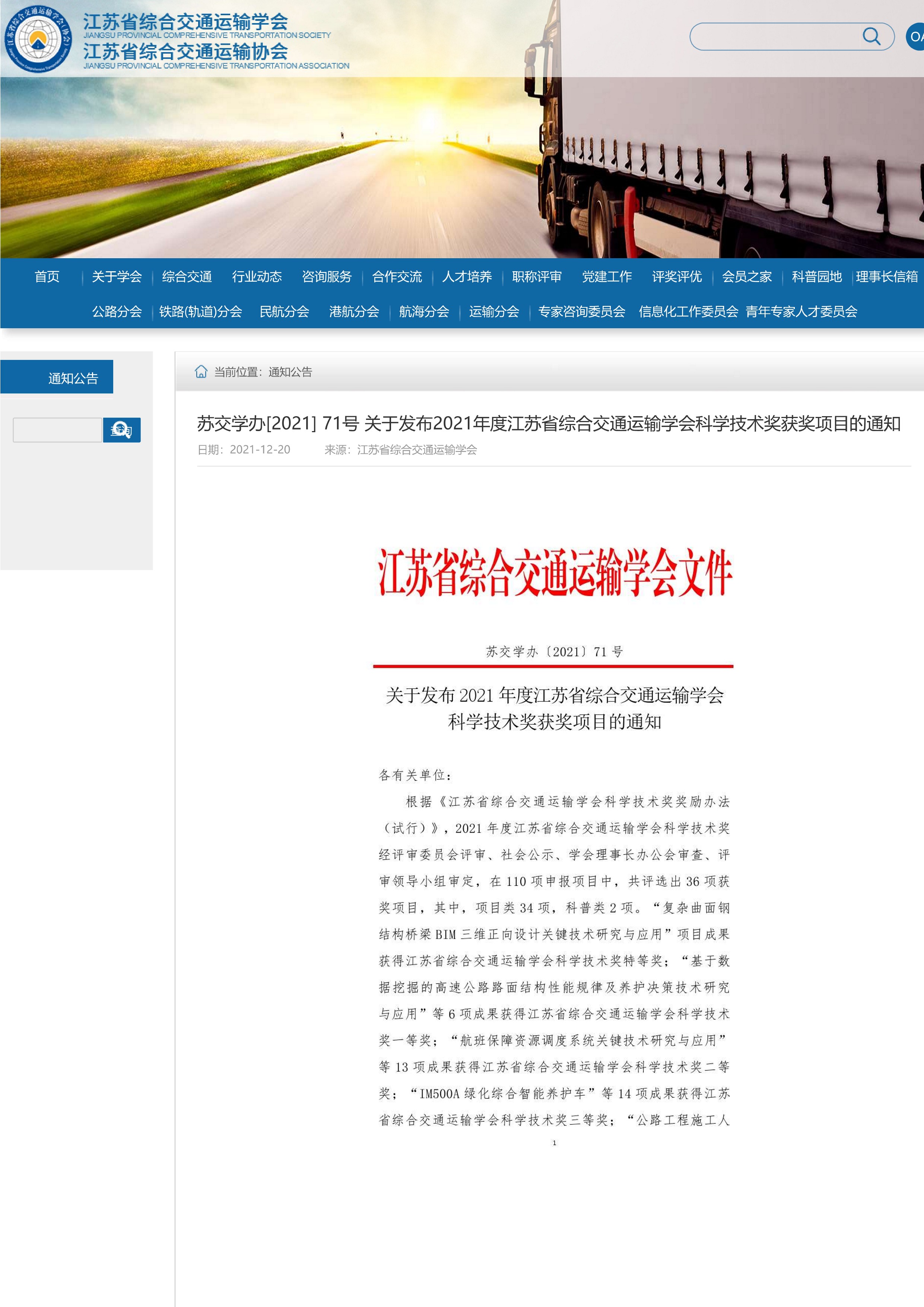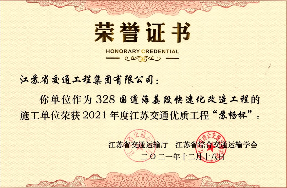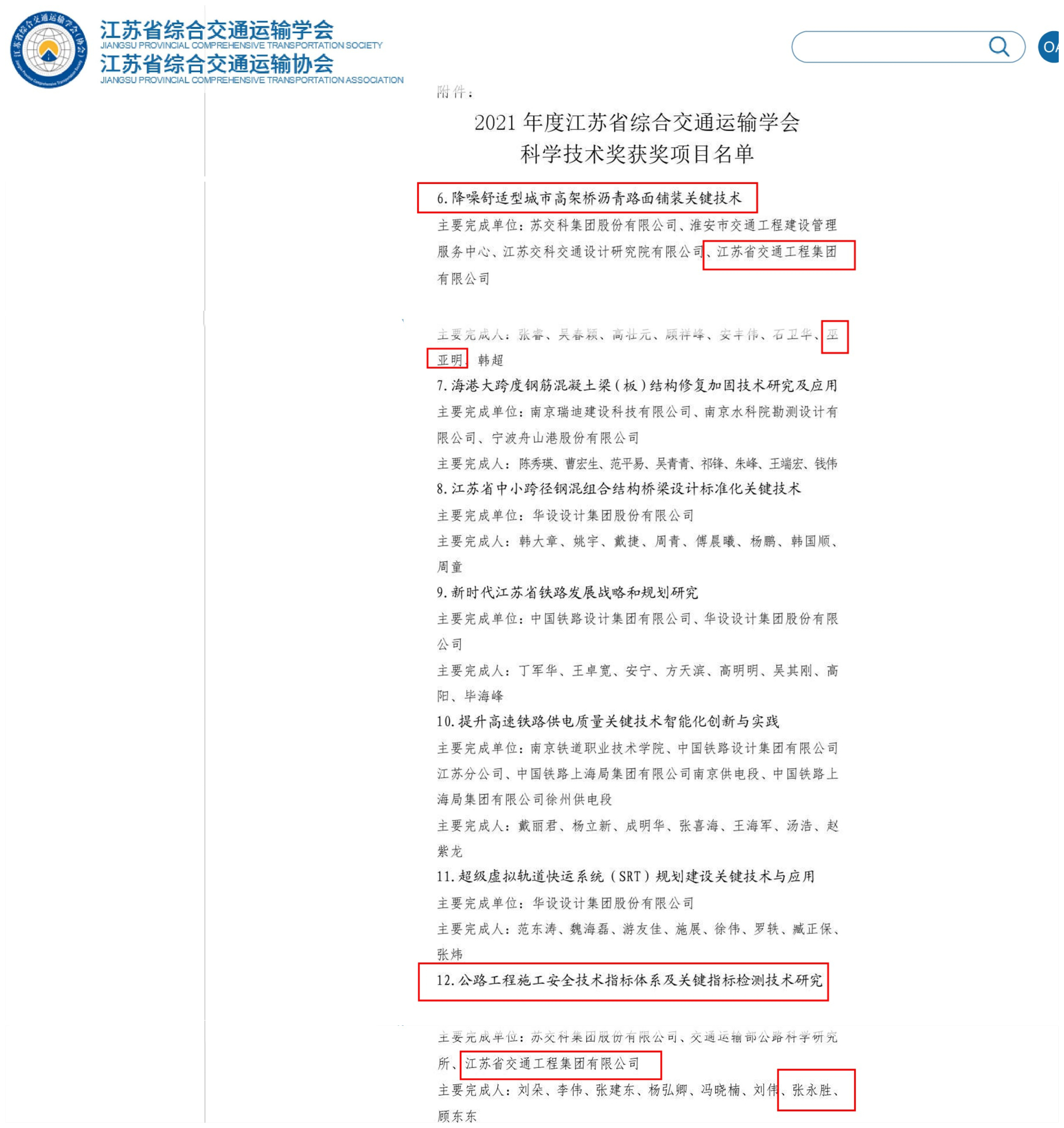 近日,江苏省综合交通运输学会(协会)2021年度系列评审评奖评优结果公布,集团公司参与完成的《降噪舒适型城市高架桥沥青路面铺装关键技术》《公路工程施工安全技术指标体系及关键指标检测技术研究》获得科学技术奖二等奖;328国道海姜段快速化改造工程获江苏交通优质工程奖。