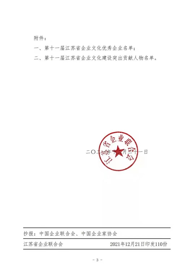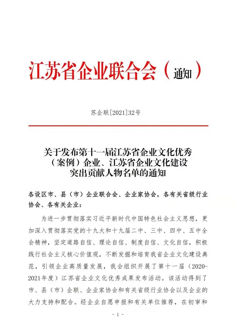 12月27日,江苏省企业联合会公布“第十一届江苏省企业文化优秀企业”“第十一届江苏省企业文化建设突出贡献人物”名单,经企业申报、单位推荐、专家评审等综合程序,全省共有31家单位被评为“江苏省企业文化优秀企业”,集团公司榜上有名。