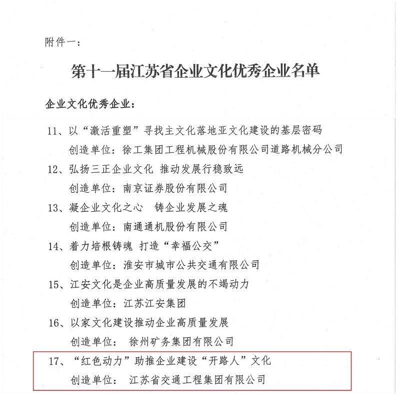 企业文化是企业的灵魂。多年来,集团公司高度关注企业文化建设,将企业文化理念融入集团公司内部管理和经营发展,通过加强党建引领、坚持战略指导、紧抓文化活动、强化制度支撑、聚焦品牌弘扬等多项重要举措,不断将“红色基因”转化为“红色动力”,构建起具有时代特征和江苏交工特色的“开路人”文化体系。以企业文化凝聚共识、引领发展,集团公司开创了社会声誉不断提高,企业经营管理、经济效益明显提升的良好局面:312国道无锡段和镇江段、江阴滨江路等多个重点项目成功落地;垣渑高速、苏锡常南部通道、杭州03省道等一批重大项目建成通车;先后荣获江苏省科技进步一等奖、国家优质工程奖、“世界人行桥奖”银奖等重大奖项;涌现出以江苏省劳动模范赵永军为代表的一批先进个人。