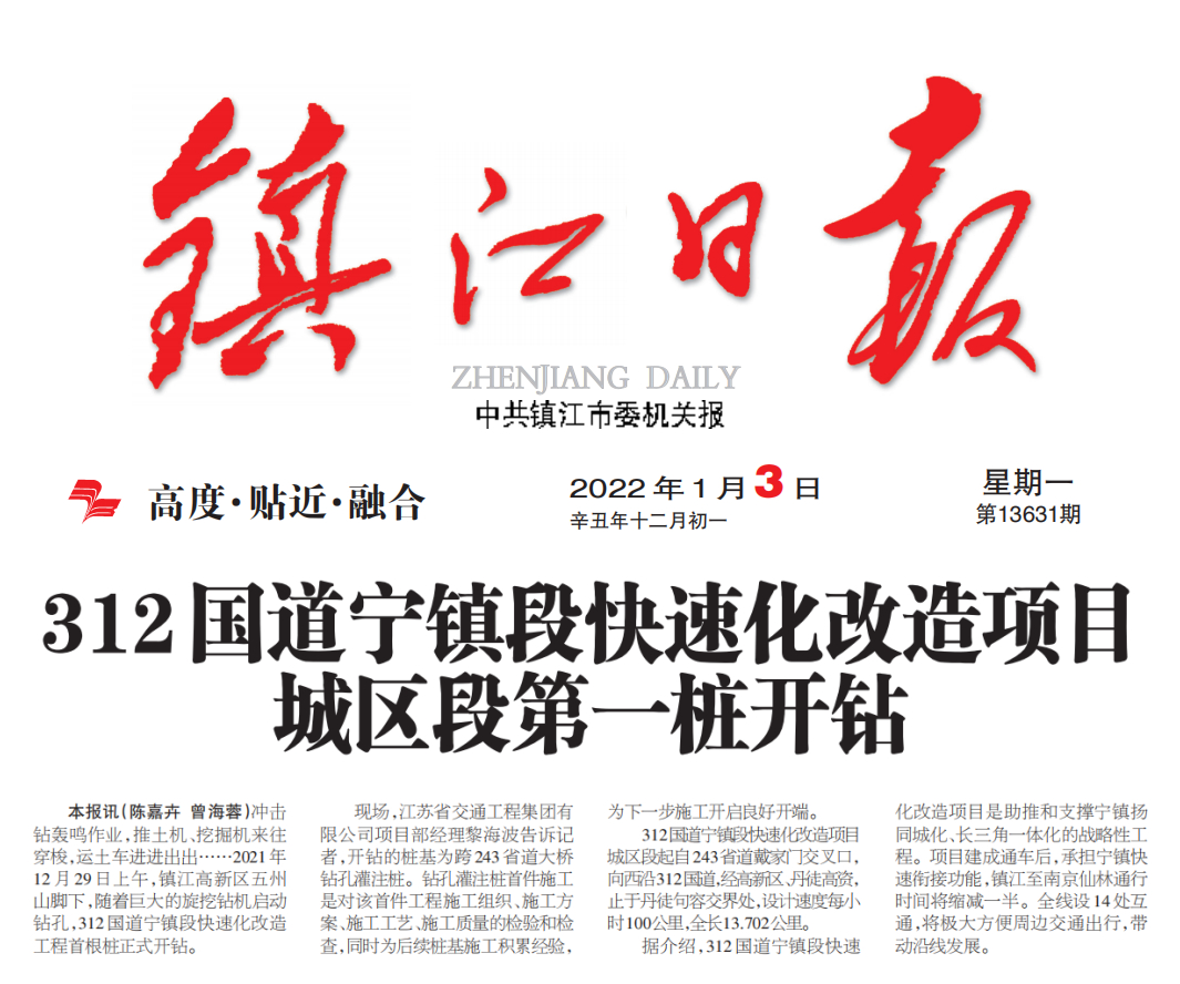 1月3日,《镇江日报》2版要闻刊登的《312国道宁镇段快速化改造项目城区段第一桩开钻》,报道了集团公司承建的G346-CQ1标主线跨243省道大桥右幅2-1#桩正式开钻。