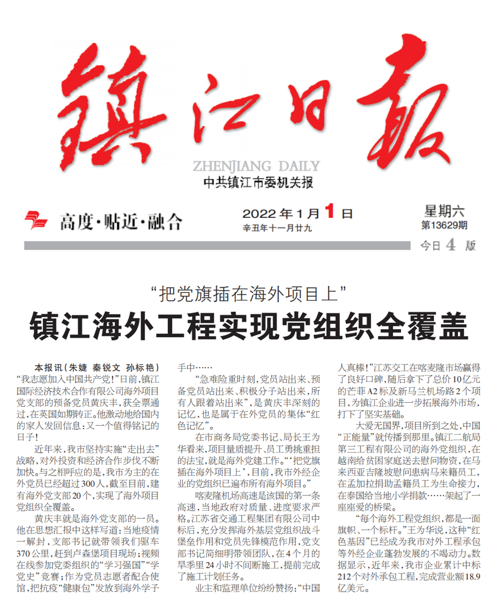 1月1日,在《镇江日报》头版刊登的《镇江海外工程实现党组织全覆盖》文章中,介绍了集团公司喀麦隆机场高速项目基层党组织工作。