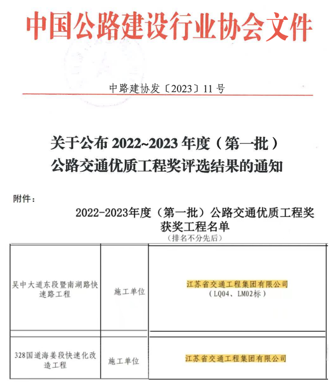 2月14日,2022-2023年度(第一批)公路交通优质工程奖评选结果火热出炉,集团参建的苏州吴中大道东段暨南湖路快速路工程、328国道海姜段快速化改造工程2项工程荣膺登榜。
