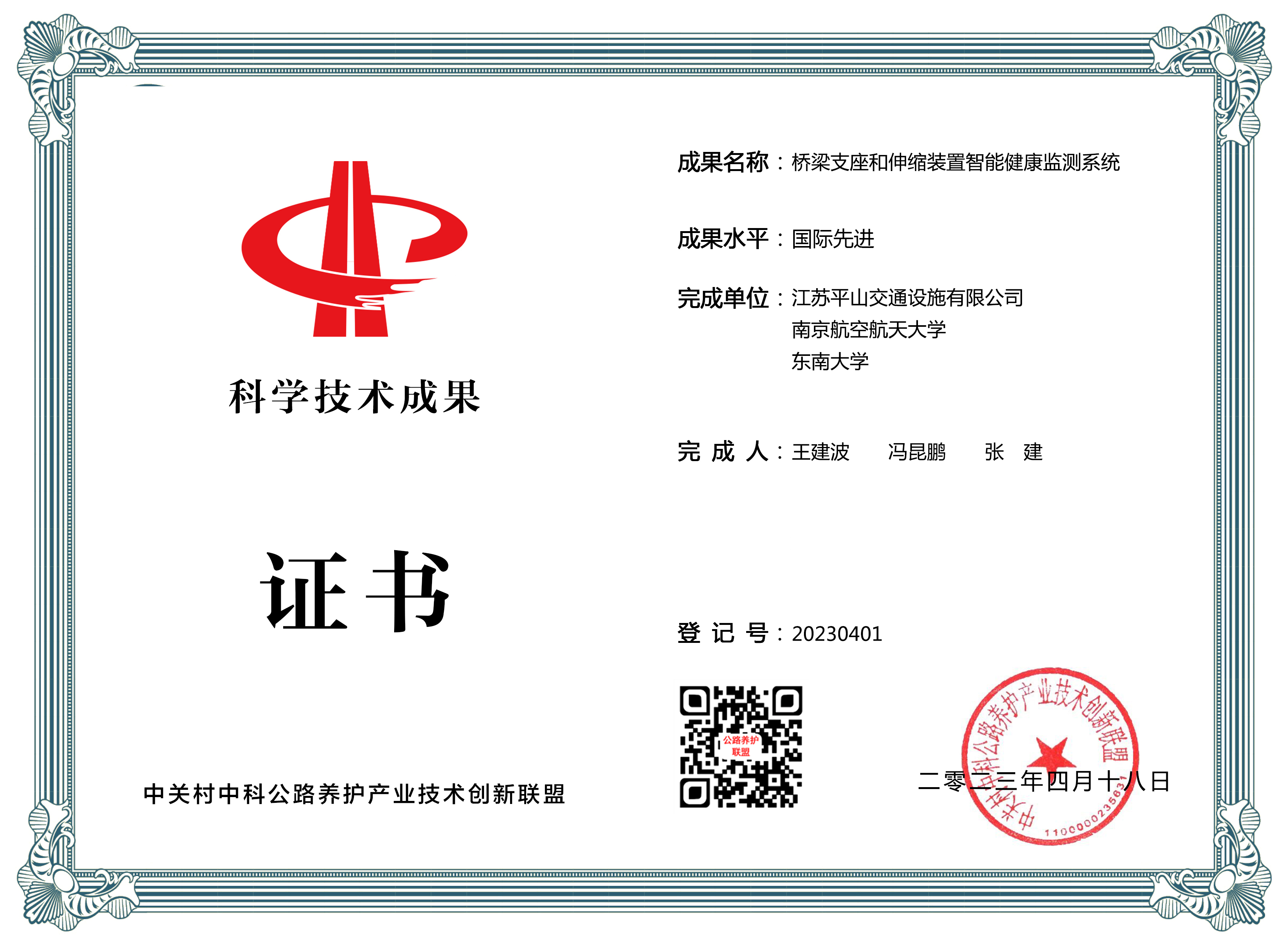 据介绍,《桥梁支座和伸缩装置智能健康监测技术》开发了桥梁支座压缩变形、剪切变形、倾角、盆圈变形和结构振动多传感终端,研制了桥梁支座智能监测系统,解决了我国桥梁支座多参数综合智能监测的技术难题,实现了我国桥梁支座监测手段向智能化数字化的转型提升;开发了桥梁模数式伸缩装置自由变位、主要构件承载力、中梁断裂、胶条漏水、横风预警的多传感终端,研制了桥梁模数式伸缩装置智能监测系统,也解决了我国桥梁模数式伸缩装置多参数耦合智能监测的问题,为我国大跨桥梁模数式伸缩装置监测提供了数智手段;开发了低功耗的边缘计算技术和多端监测平台APP软件,研制了云计算与风险智能预警平台,实现了桥梁支座和伸缩装置全状态监测,为桥梁健康监测、风险预测评估、寿命分析和科学养护提供了支撑。该项成果由集团公司旗下江苏平山交通设施有限公司、南京航空航天大学、东南大学联合研究。