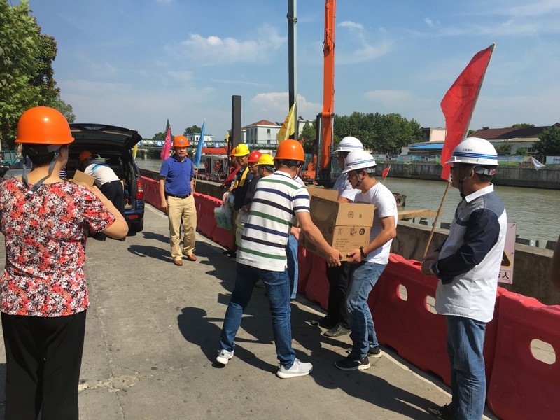 7月20日下午,气温高达39摄氏度,嘉兴市交通局副局长董学军及嘉兴市港航局副局长吕健伟等领导一行来到杭平申线桐乡段3标,亲手为正在忙碌着的工人送上防暑慰问品,并亲切的握住大家的手说:大家辛苦了!一定要注意身体。