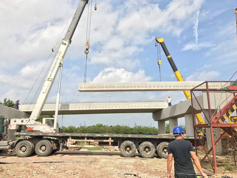 寰庆桥全长418.04m,跨径组合为4x20m(预应力砼空心板)+4x20m(预应力砼空心板)+91.24m(钢桁架桥)+4x20m(预应力砼空心板)+4x20m(预应力砼空心板),共416片20米预制板梁,根据现场拆迁情况,目前已完成了寰庆桥左幅2#墩~9#墩盖梁和151片预制板梁,每片板梁重达29t左右。板梁安装前,项目部做好了充分准备,从板梁进行出厂质量检查到确认运梁路线,再到铺设墩柱间运梁便道钢板,测量放样支座垫石等,每个环节都一丝不苟。板梁从巴城预制场出发,每辆平板车运两片梁,整个吊装采用一台50t吊车和两台25t吊车进行安装,确保了现场施工平稳有序。(徐小刚)