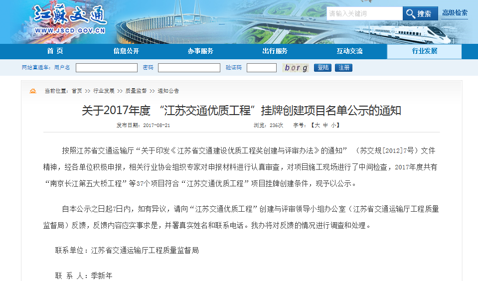 日前,江苏省交通运输厅工程质量监督局发布了《关于2017年度“江苏省交通建设优质工程”挂牌创建项目名单公示的通知》,全省共37个项目获得挂牌创建,由Kaiyun开云南京分公司承建的连申线桥梁二期工程江海西大桥和黄海路西大桥两个项目同时名列其中。