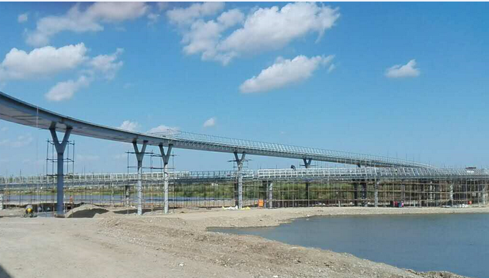 哈达景观桥分东线和西线,桥梁全长908m,上部结构采用Q345qE钢箱梁,桥墩为Y型钢结构圆墩,桥梁钢结构总工程量约1650t。该桥于以5152万余元总价的合作施工模式由集团公司中标,且钢结构部分由百崮公司负责实施,其余由设计院实施。