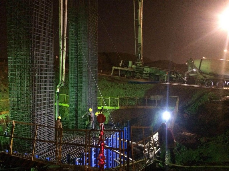 此次施工的承台为主线高架桥M16承台,按照施工设计,该承台共需浇灌砼150立方米,尺寸为长7.6米、宽6.6米、高3米。为确保首个承台的浇筑,项目部提前谋划、精心组织施工、积极优化施工方案,严格控制测量放样、桩基检测、基坑开挖、桩头凿除、垫层浇注、钢筋绑扎、模板安装、墩柱钢筋预埋以及承台浇筑等各工艺流程环节,严格按照施工规范作业,同时积极开展班前施工安全质量教育培训,确保整个浇筑施工圆满完成。