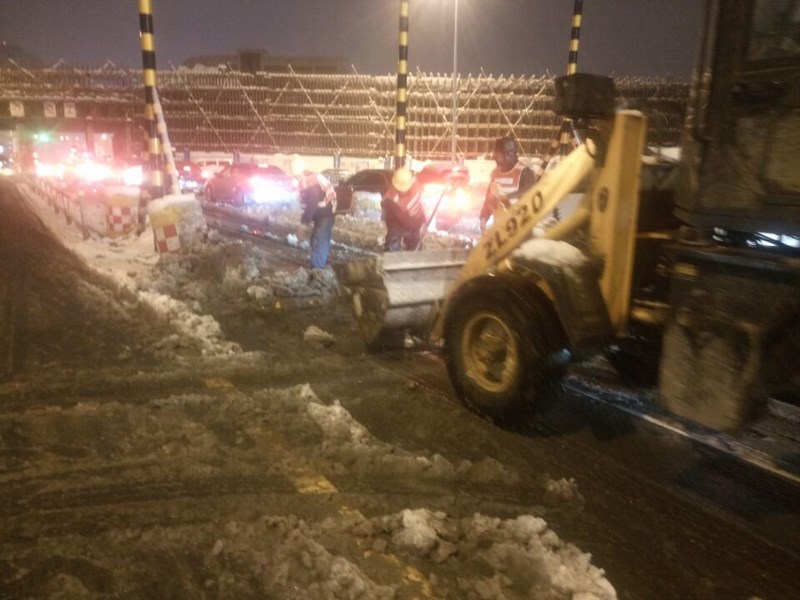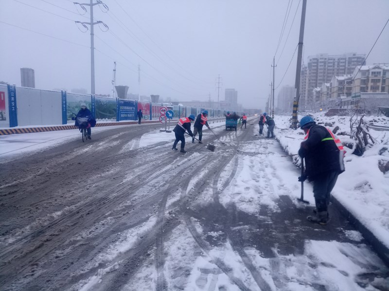 项目部人员利用铁锹上路除雪