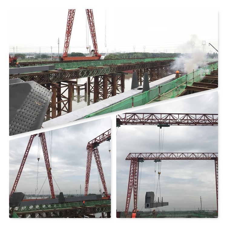 5月8日上午9点半,寰庆桥主桥钢桁架梁东西两侧的下弦杆E0-E2(E0’-E2’)采用16T龙门吊吊装平稳地落在了临时支撑上,伴随着炮竹声此起彼伏,为寰庆桥主桥钢桁梁正式安装施工拉开了帷幕。