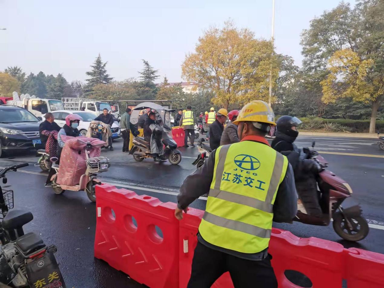 京沪高速台州路分离式立交桥跨台州路部分全长130m,右幅宽度2*13.5m,上部结构为预应力现浇连续箱梁,共5跨,跨径为(21+24+2*30.5+24)m,下部构造为柱式桥墩。此次拆除难度较大,作为沭阳城区主干线之一的台州路是来往沭阳经济开发区北区的交通要道,交通流量大,为了把交通运行影响降到最低,指挥部多次组织项目部、总监办及有关专家对交通组织和拆桥方案进行反复论证和优化,并召开工作协调会。同时,项目部协同作战、超前谋划,针对全流程进行明确分工,为桥梁除施工做好充分保障。