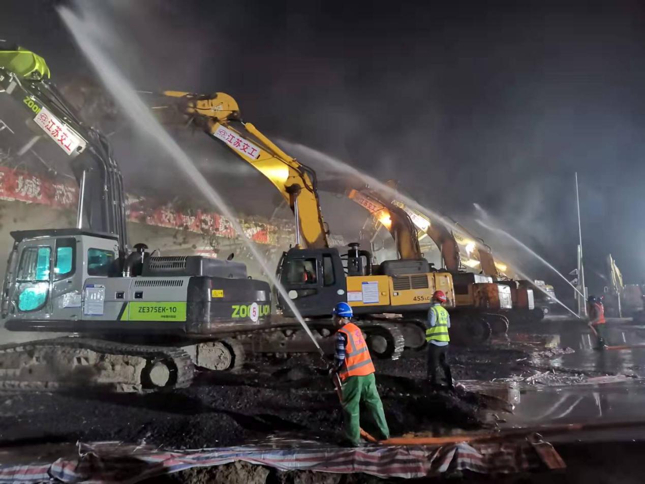 在有关部门的大力支持下,在有限的施工区域内投入凿岩机22台、雾炮车1台、高压水泵4台、水车2台,消防车2台,经7.5个小时连续作业,台州路跨京沪高速公路大桥右幅成功拆除,整个拆除过程安全、高效、环保。